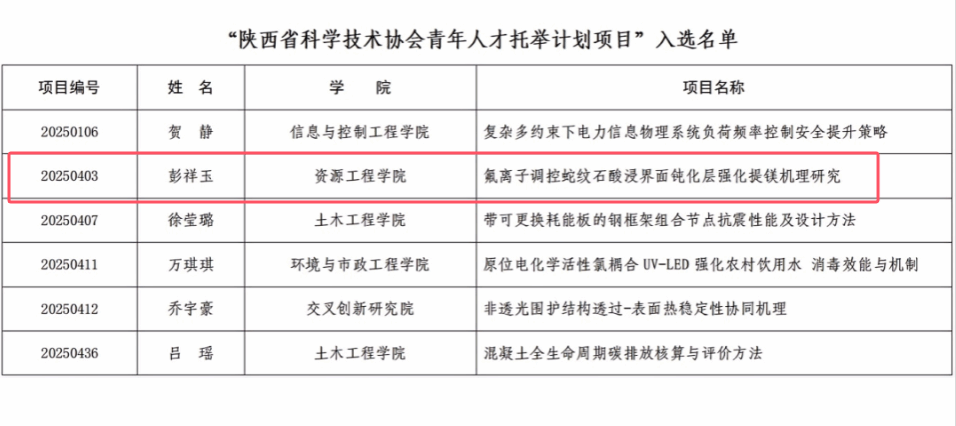 近日,陕西省科协公布2025年青年人才托举计划项目入选名单,我院教师彭祥玉申报的"氟离子调控蛇纹石酸浸界面钝化层强化提镁机理研究"项目成功入选。该项目的获批彰显了我院在人才队伍建设和科研创新方面取得了新成果。