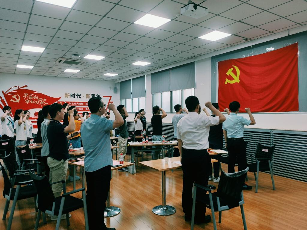 党旗下,全体同志肃然起敬,举起右拳,重温入党誓词,声声话语表初心,句句誓言明决心。