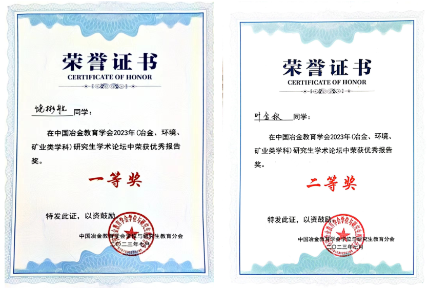 7月9-11日,由中国冶金教育学会学位与研究生教育分会主办、内蒙古科技大学承办的中国冶金教育学会2023年(冶金、环境、矿业类学科)研究生学术论坛在内蒙古包头市举办。我院研究生叶金秋、饶彬舰参加矿业分论坛并取得佳绩。
