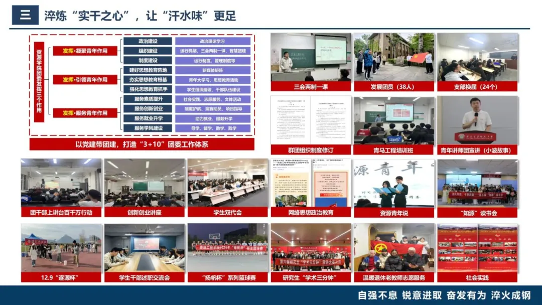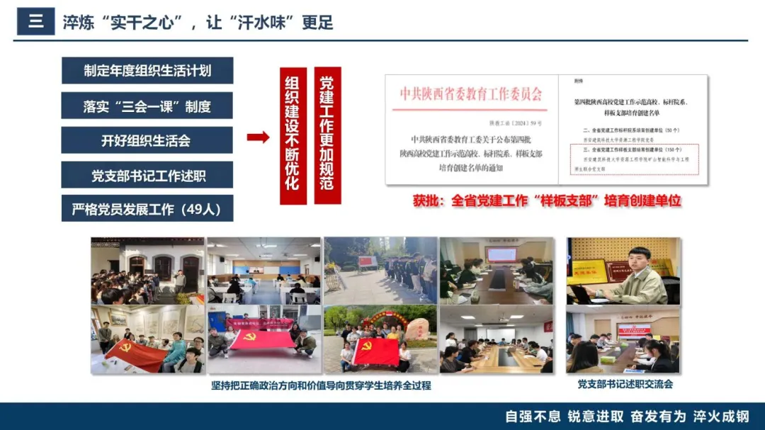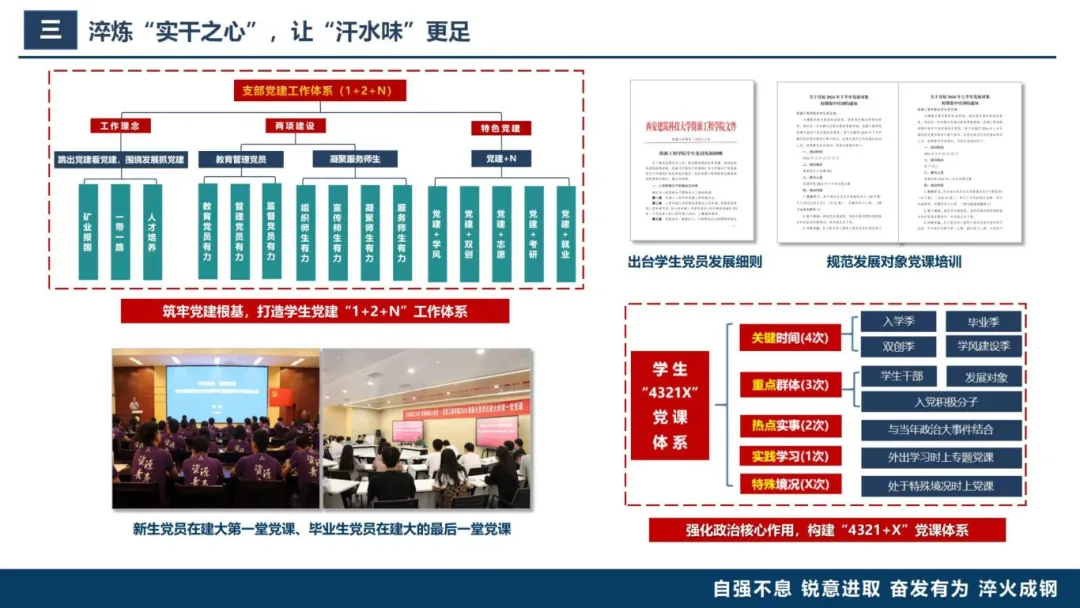 学生党员发展细则》、制定年度组织生活计划、落实“三会一课”制度等不断优化组织建设。2024年助力矿山智能科学与工程师生联合党支部入选全省党建双创“样板支部”,这就是实干的成果见证。