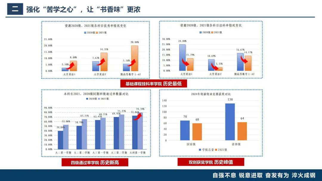 在“6+5+4”学风框架的引导和学院精神的激励下,所带21级本科生上进心不断增强,学风建设成效显著。一是基础课程挂科率创学院历史最低、优秀率大幅提升;二是四级通过率创学院历史新高,实现从全校倒数进入前6的显著进步;三是2024年双创获奖创学院历史峰值,占学院获奖体量2/3;四是助力3名国家专项计划学生逆袭推免,年级升学深造率已突破52%;五是年级就业率位列全校前列,矿业签约学生全部选择扎根矿企。真正做到了小体量、大收获!