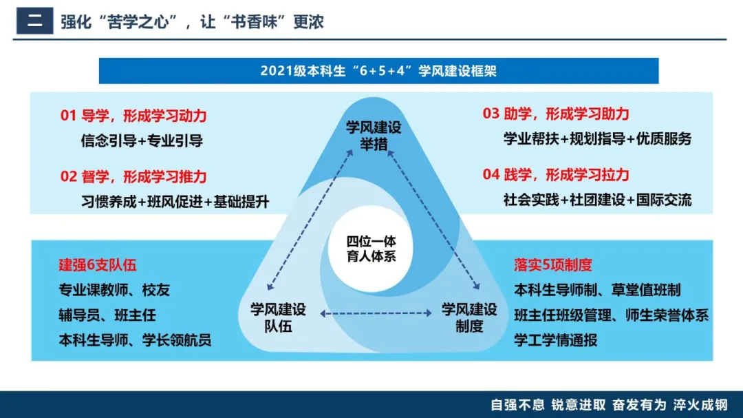 社会对行业认知偏差,导致矿业、安全专业成为“低分调剂”的代名词,生源结构不合理、入校基础薄弱、专业认同感低等问题进一步加剧。他通过每学期制作学情分析、剖析学业问题,对症下药提举措。以学院“四位一体”育人体系为基础,搭建年级“6+5+4”学风建设新框架,建强专业课教师、校友、辅导员、班主任、本科生导师、学长领航员6支队伍,落实本科生导师制、班主任管理制度、教职工晚自习值班制、师生荣誉体系、学工学情通报5项制度。铸牢导学、督学、助学、践学4方面举措。