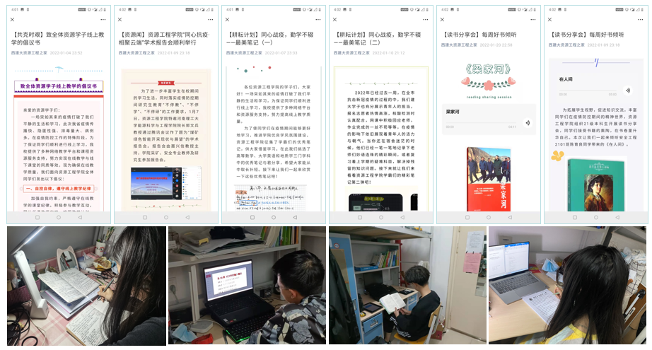 学院积极落实不停教、不停学、不停研的要求,全力确保线上教学质量,提高线上学习活力,并重点做好特殊时期学风建设工作。学院第一时间发布《致全体资源学子线上教学的倡议书》,组建学风督促小组,排查线上学习困难,抽查线上课堂情况。在“辅导员—班委—舍长”学风建设专项联动结构下,宿舍早、晚自习打卡活动进展顺利,3期“同心战疫,勤学不辍”主题最美笔记展、3期每周好书倾听活动也在学生中起到良好带动作用。同时,学院组织开展“同心抗疫,相聚云端”、“战疫不停学,分享聚云端”等主题学术报告共计5场,持续开展研究生科研能力培训。