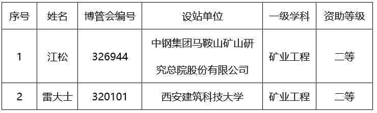 近日,中国博士后科学基金第72批面上资助(包括面上资助“地区专项支持计划”)评审结果公布,其中我院1名青年教师在快猫短视频 博士后流动站申报获得资助(全校共有9人获选),另有我院1位青年教师在中钢集团马鞍山矿山研究总院股份有限公司博士后科研工作站申报获选,获选名单如下: