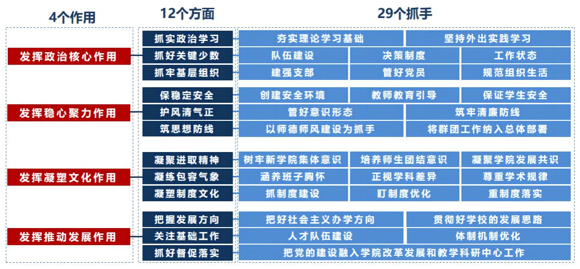 党委秉持“跳出党建看党建,围绕发展抓党建”的党建理念,提出了“强核心、保稳定、塑文化、促发展”的工作思路,努力营造团结协作氛围、倡导进取包容文化,逐步搭建了“4+12”工作体系,即以政治核心、稳心聚力、凝塑文化、推动发展“4个作用发挥”为出发点和落脚点,重点围绕12个方面开展工作,不断强化思想政治教育力度和深度,凸显先进思想的引领成效,以强化思想共识汇聚起学院跨越式发展的磅礴力量。