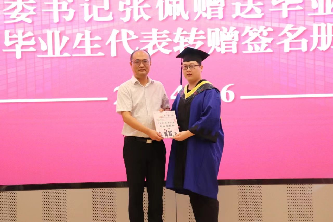 学院党委书记张佩代表学院向毕业生赠送了毕业纪念章,安全工程2001班王雪梅作为毕业生代表接收纪念章。资源研2105班赵坤庆代表全体毕业生向学院呈递《毕业签名纪念册》,张佩代表学院接收《毕业签名纪念册》。