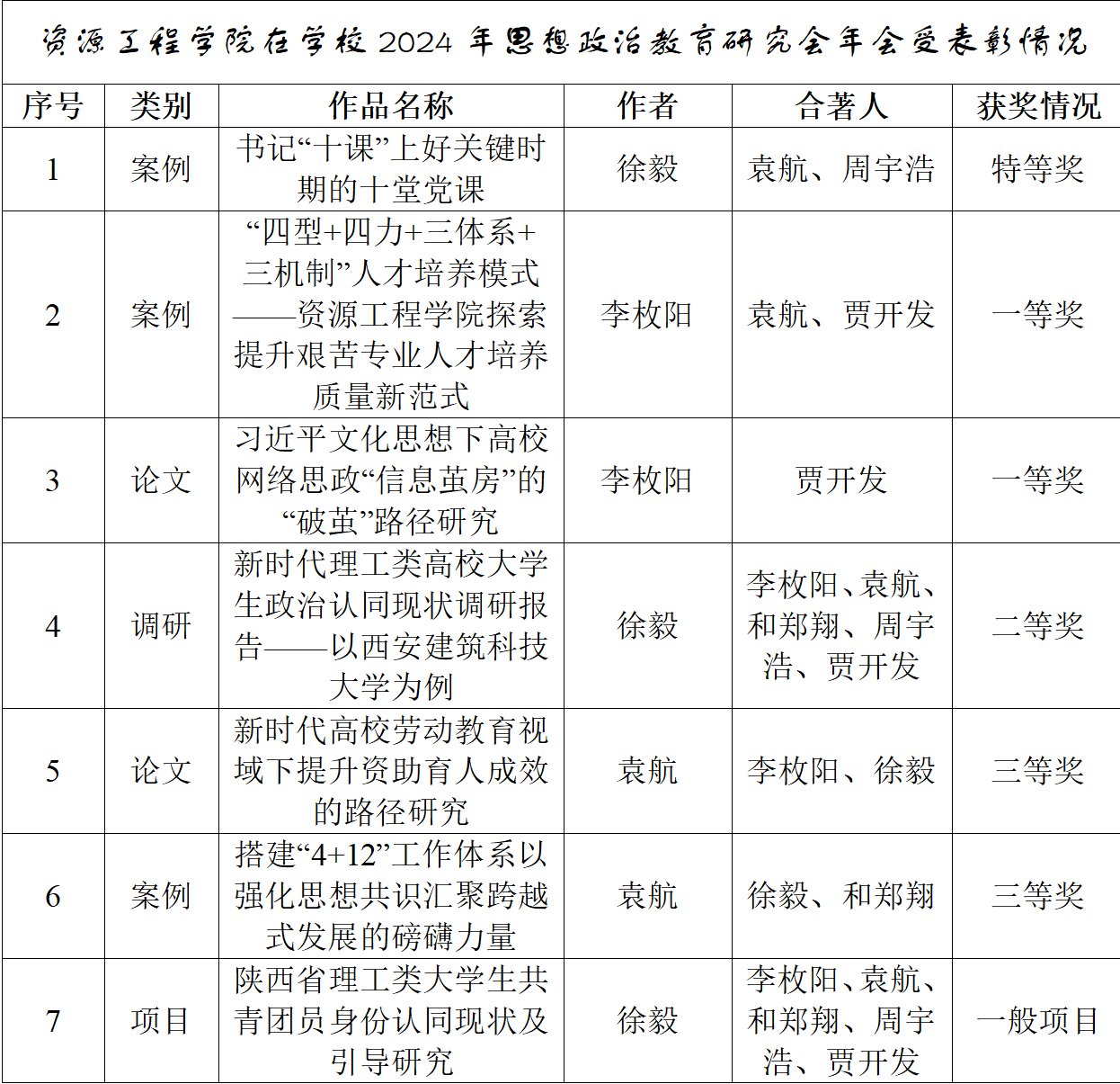 7月2日,在学校思想政治工作会暨思想政治教育研究会2024年年会上,表彰了近两年学习思想政治工作获奖人员,学院学工队伍取得优异成绩,一般研究项目立项1项,荣获优秀论文一等奖1项、三等奖1项,荣获优秀案例特等奖1项、一等奖1项、三等奖1项,优秀调研报告二等奖1项。