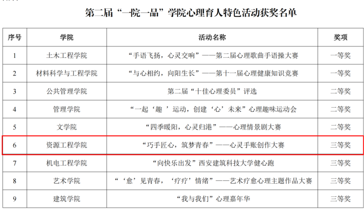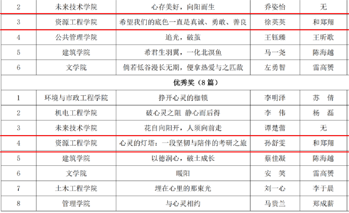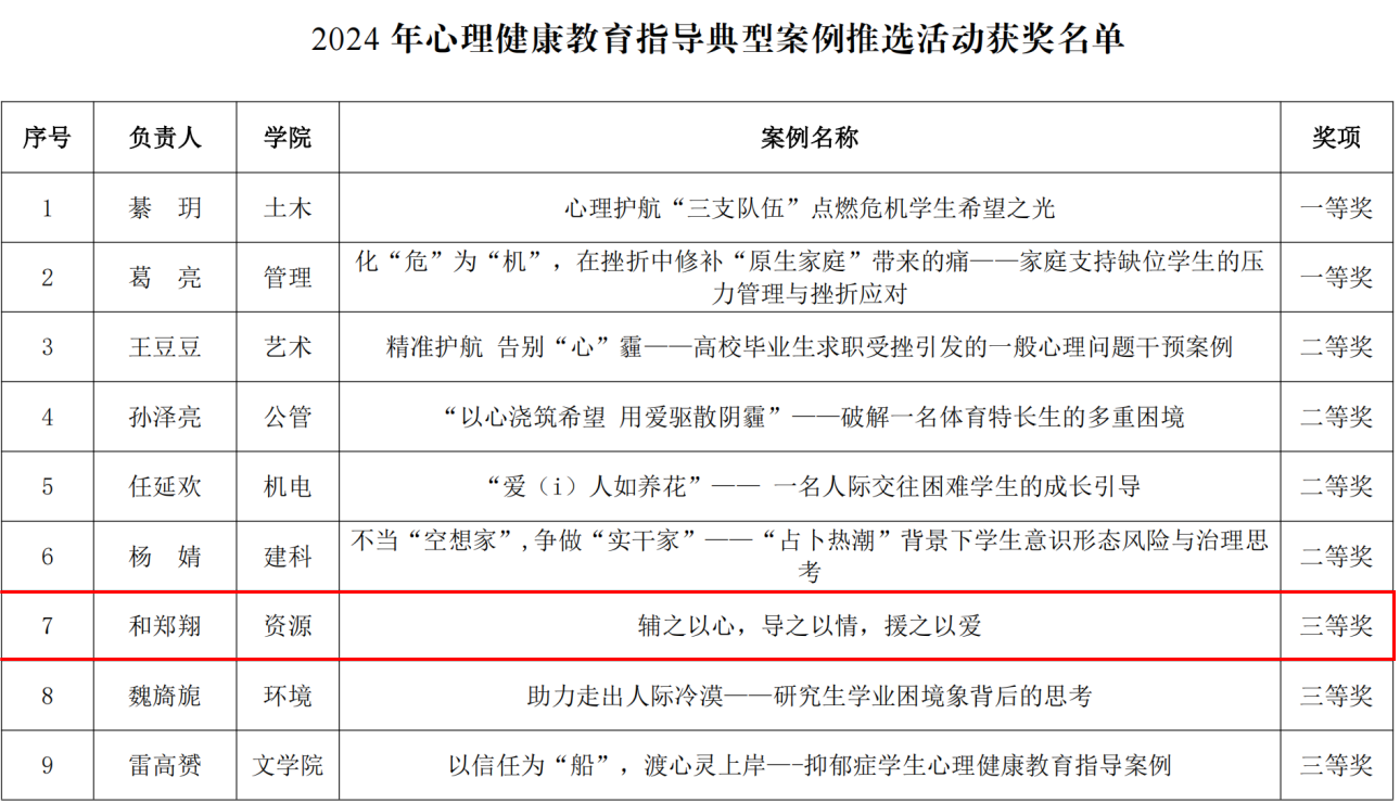 “十佳心理委员”荣誉称号;在“心相遇 爱同行——心理健康教育伴我成长”心理健康主题征文活动中,由学院团委副书记和郑翔指导、学生徐英英撰写的《希望我们的底色一直是真诚、勇敢、善良》和学生孙舒雯撰写的《心灵灯塔:一段坚韧与陪伴的考研之旅》分别获得三等奖和优秀奖;学院团委副书记和郑翔撰写的《辅之以心,导之以情,援之以爱》在2024年心理健康教育典型案例推选活动中荣获三等奖;学院在第二届“一院一品”学院心理育人特色活动中荣获三等奖。